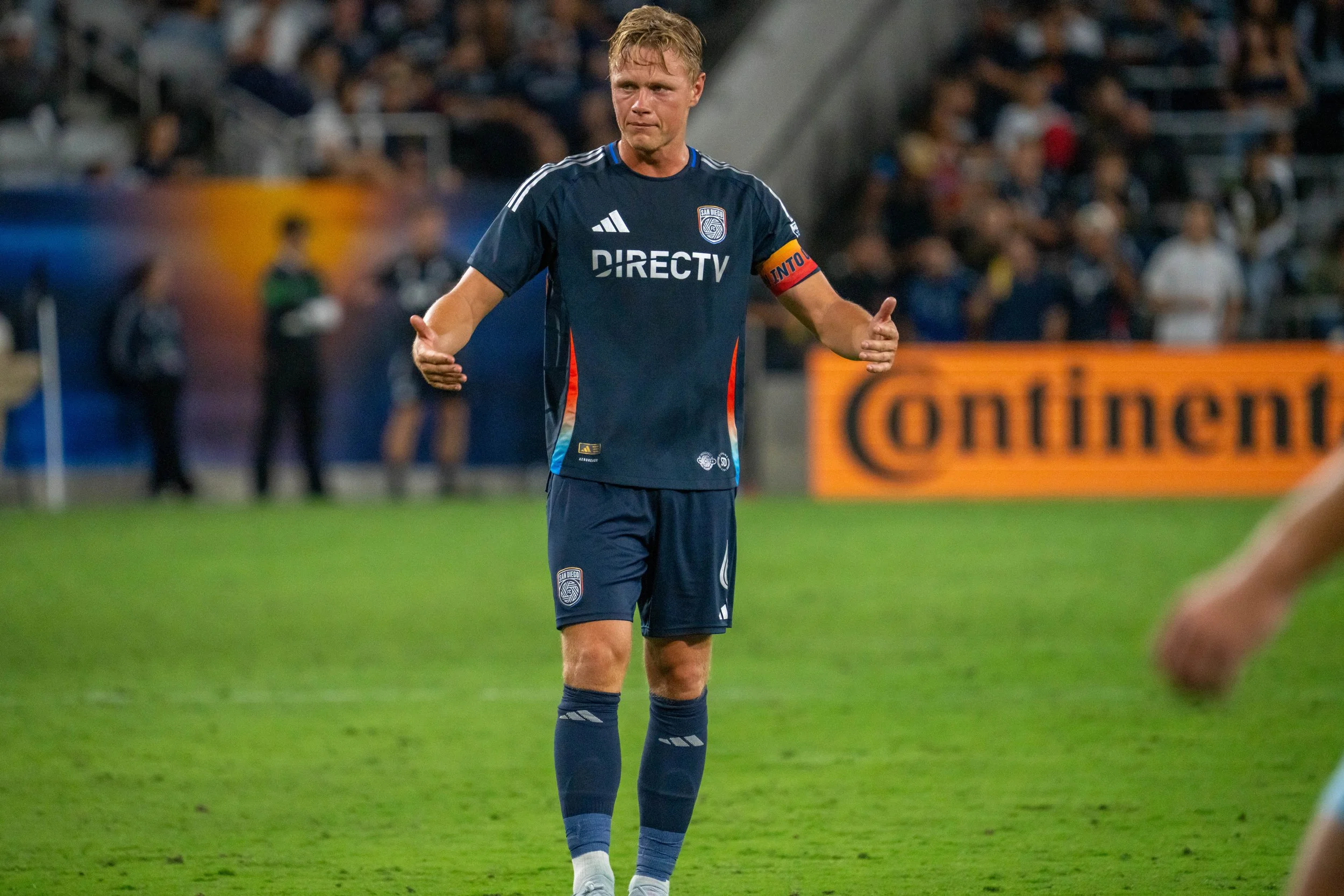 San Diego FC captain Jeppe Tverskov talks to his team during the club’s 3-1 loss against Minnesota United. (Emmanuel Alonso/Sandiego.futbol)